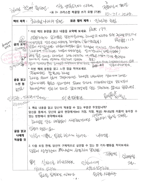 아래 자료는 마00 권사님께서 8주간의 크리스천 북클럽을 참여하시는 동안 스스로 준비하셨던 자료입니다. 크리스천 북클럽의 쓰기 모형 기본을 제공해 드렸는데 거기에 맞춰서 최선을 다해 준비하셨습니다. 일체의 수정을 하지 않았고, 본인이 준비하신 그대로를 스캔하여 업로드 하였습니다. 실제 북클럽에 참여하시는 분이 어떤 식으로 어느 정도 수준에서 준비하시는지를 보실 수 있습니다.